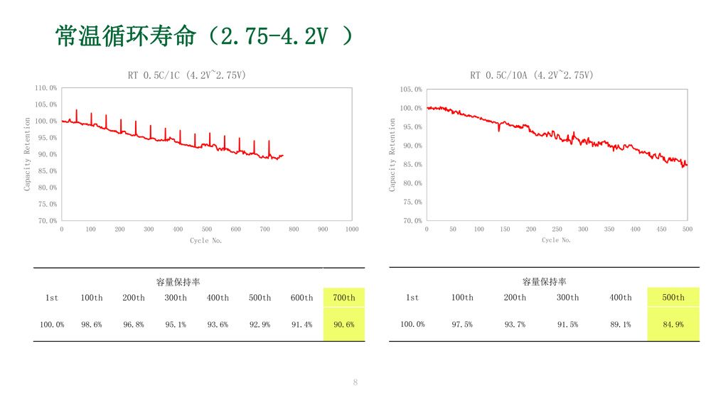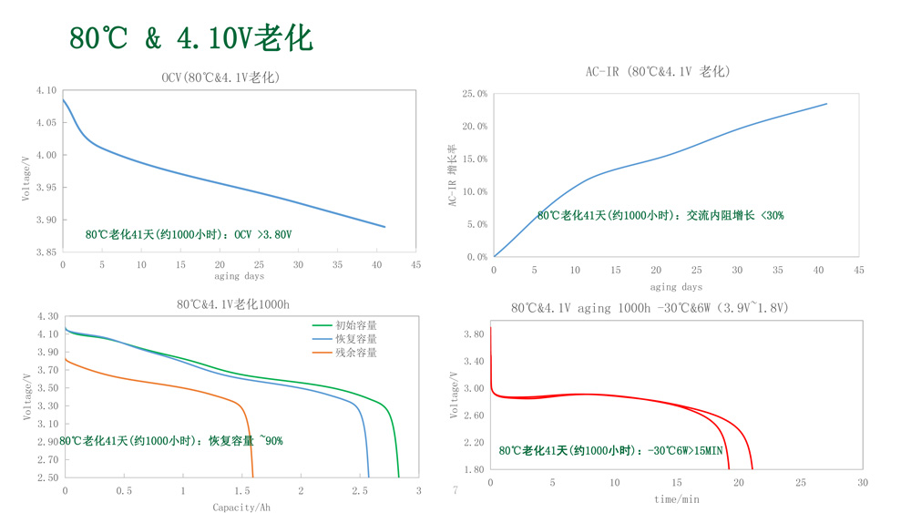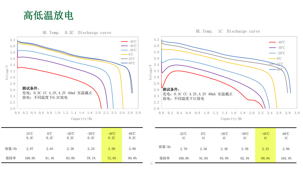 | 此款電池可以在零下-40度~高溫+85度的環(huán)境中,正常放電。電池容量最小值2800mAh~最大值2900mAh,典型電壓3.6V,工作電壓2.75V~4.2V。80度 1000小時(shí)候存儲(chǔ)可回復(fù)容量>85%,壽命>500次。 |